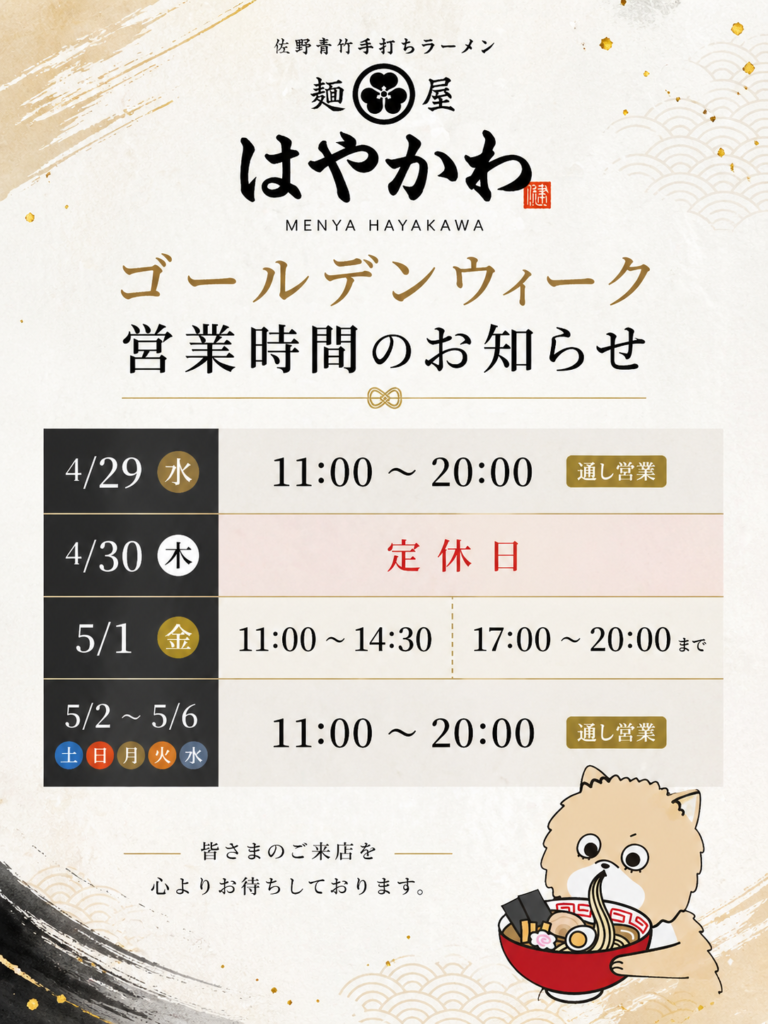 佐野青竹手打ちラーメン 麺屋はやかわでは、ゴールデンウィーク期間中、営業時間を一部変更して営業いたします。